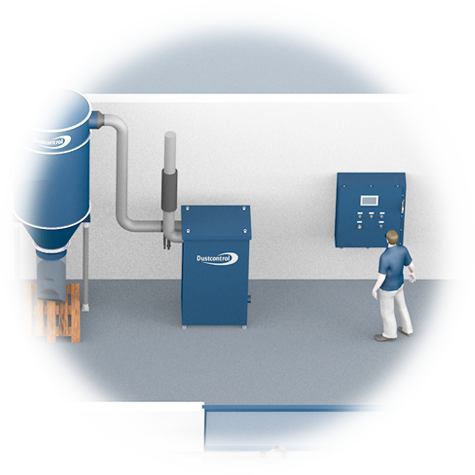 An extraction system should always be equipped with a filter unit. Dustcontrol filter units separate coarse material in the cyclone body of the unit and fine dust in an internal arrangement of conical pleated cartridge filters. Pleated filters have very high filter areas in relation to their physical size. The filter units therefore have high capacity while maintaining compact overall dimensions. Filters are cleaned with reverse pulse which results in very effective cleaning, long filter life and low maintenance. Normally the filter units are equipped with a plastic sack for collection of the extracted material but other types of discharge arrangements can also be installed.